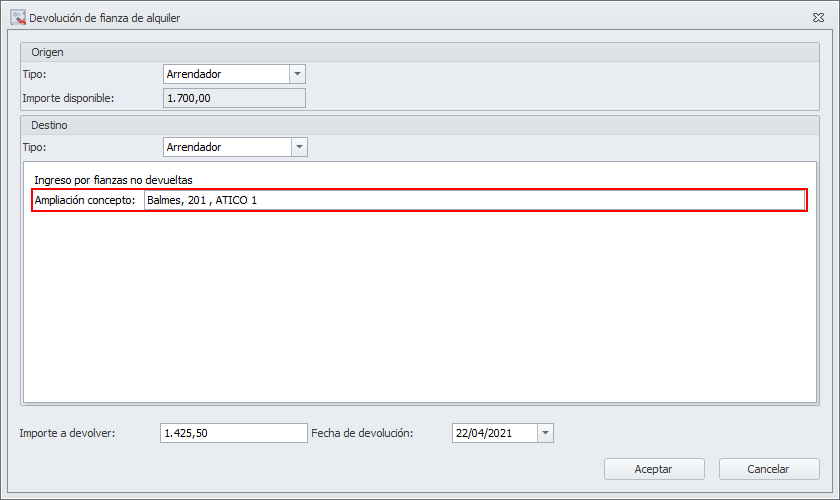 Al registrar una devolución de fianza cuyo destinatario es el arrendador, se solicita la ampliación de concepto para el ingreso, ofreciéndose por defecto la dirección del departamento.