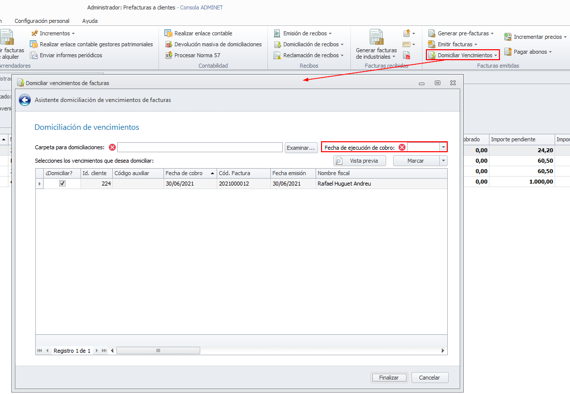 Se ha modificado el asistente del proceso Domiciliar vencimientos para que la fecha de ejecución de cobro no sea propuesta por el programa sino que deba ser cumplimentada por el usuario.
