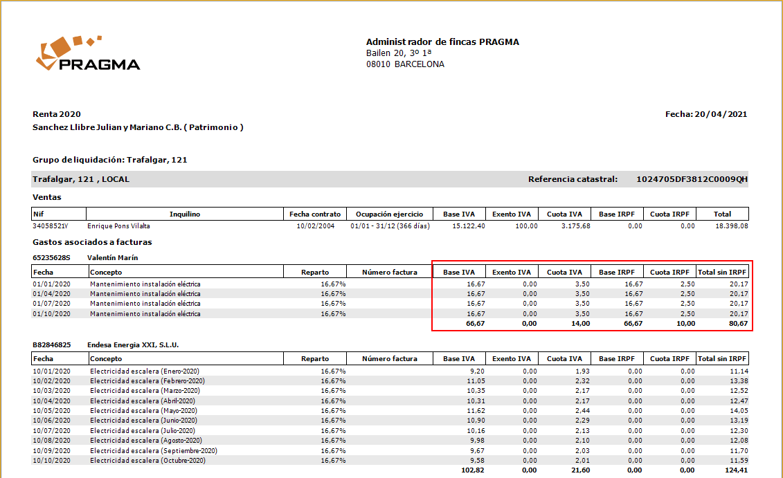 Además, se ha modificado la información de los gastos asociados a facturas para mostrar, en diferentes columnas, la base imponible, cuotas de IVA e IRPF, importe exento y total factura menos retención.