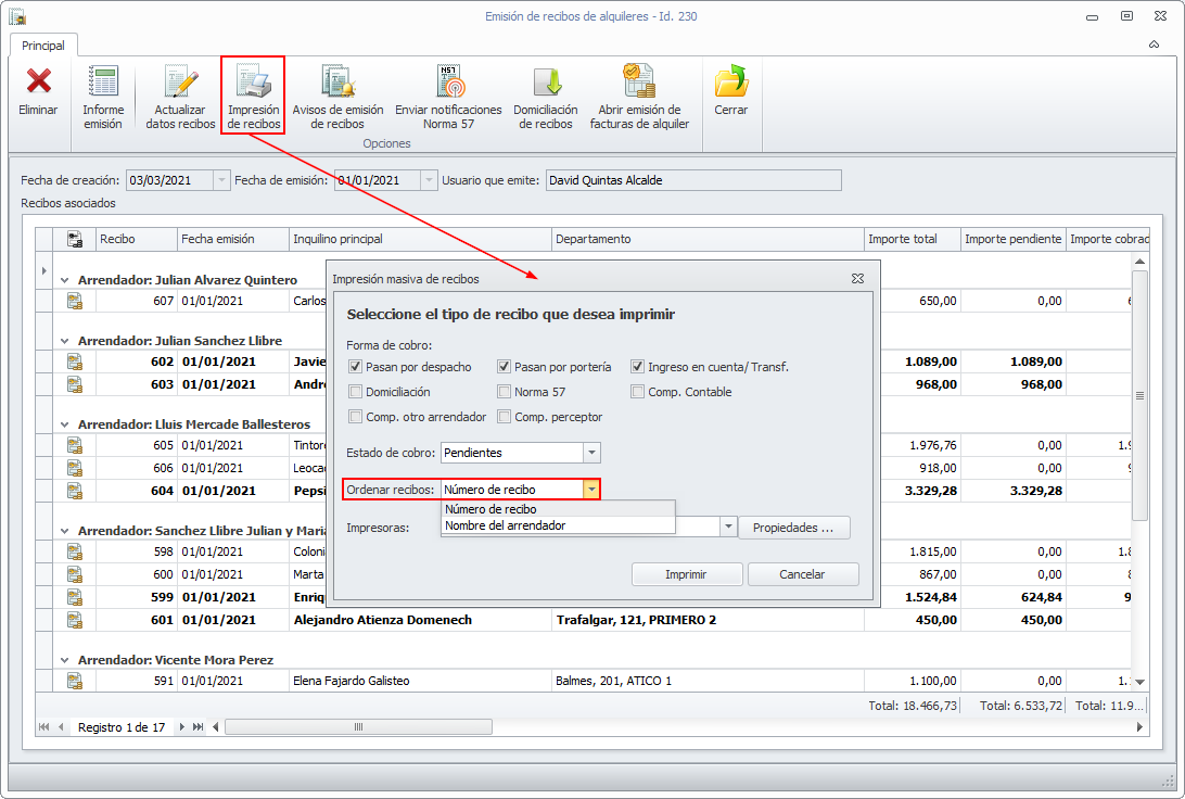 Se ha modificado el proceso de emisión de recibos para añadir, en la ventana de impresión de recibos, una nueva opción que permite escoger si se desean imprimir ordenados por número de recibo o por nombre de arrendador.