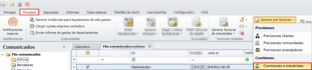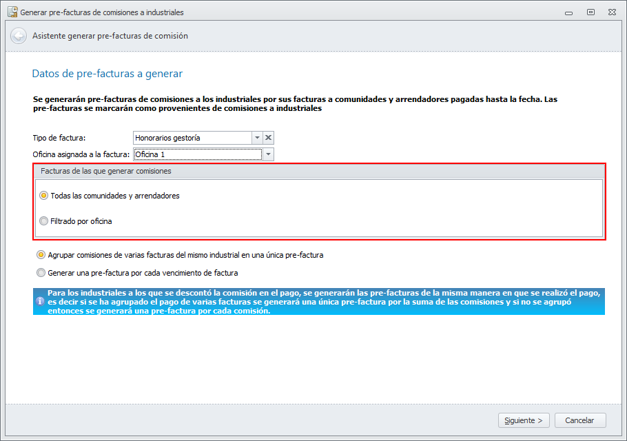 Todas las comunidades y arrendadores. No realiza ningún filtrado y se pre-facturan las comisiones de todas las facturas de industriales.
