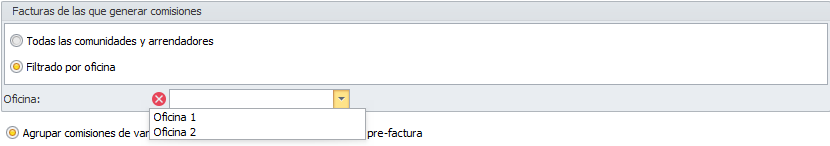 Filtrado por oficina. Esta opción abre un desplegable para que pueda escoger una oficina. De este modo, sólo se generarán pre-facturas de las facturas de industriales correspondientes a arrendadores y comunidades asignados a esa misma oficina.