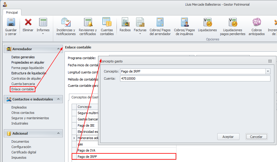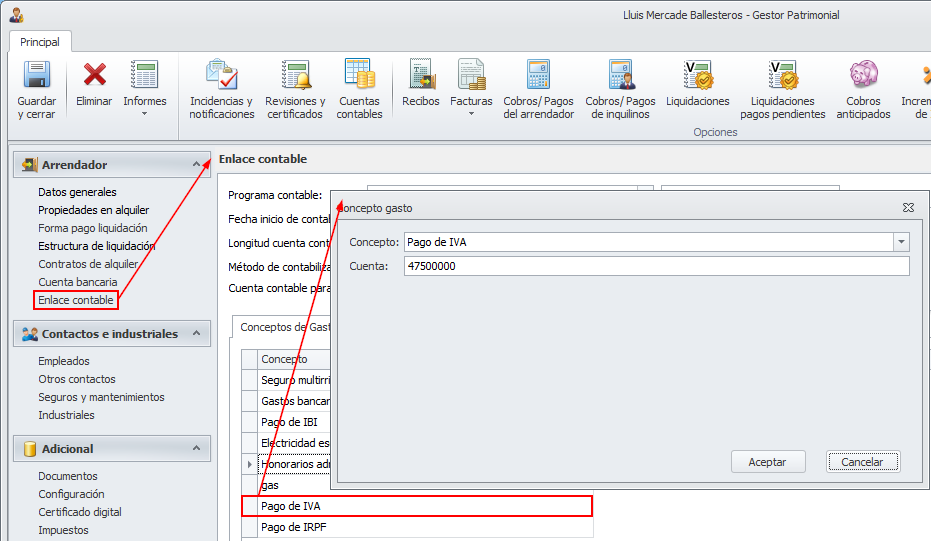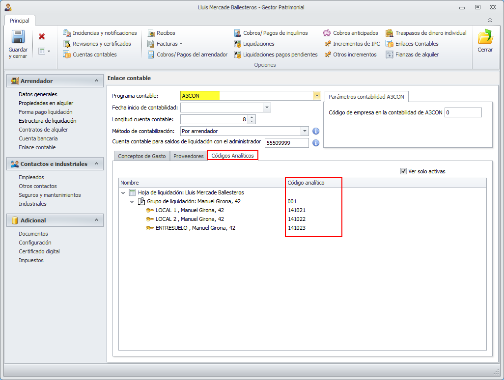 Se ha modificado la sección Enlace contable de la ficha del gestor patrimonial para que, cuando el programa contable escogido sea A3CON, permita la introducción de los códigos analíticos para los departamentos y grupos de liquidación del arrendador.