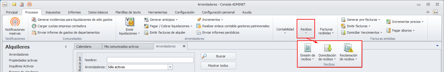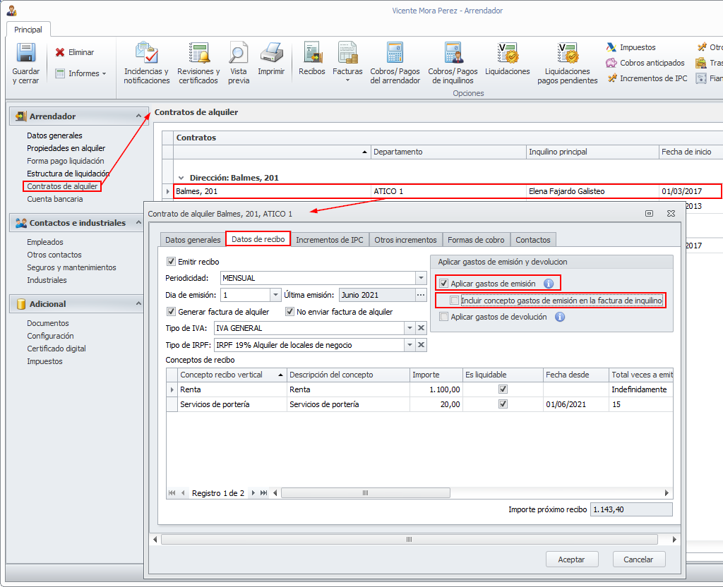 En la emisión de recibos se ha cambiado el comportamiento de la ventana que muestra los inquilinos con el contrato vencido para que, por defecto, los muestre no seleccionados y que sea el usuario el que deba activarlos si desea emitirles el recibo.
