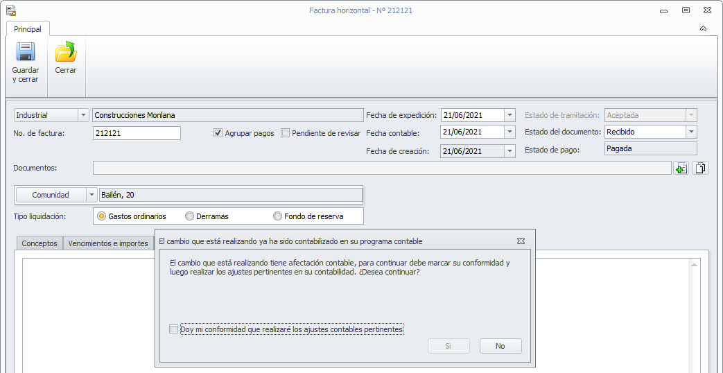 Se permite cambiar el tipo de liquidación de facturas de comunidad aunque esté enlazada contablemente