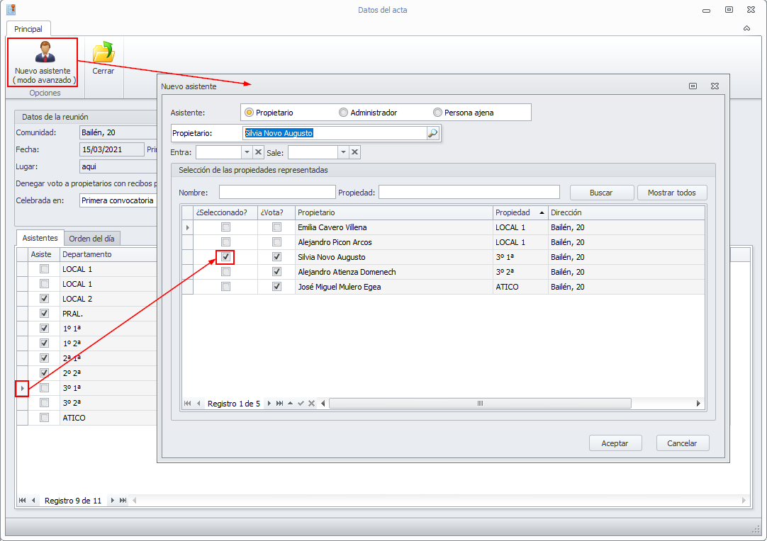 En el proceso Introducir datos de la reunión, al pulsar el botón Nuevo asistente (modo avanzado), en la nueva ventana que se abre, se preselecciona, por defecto, el propietario que tiene el foco en la ventana que la llama.