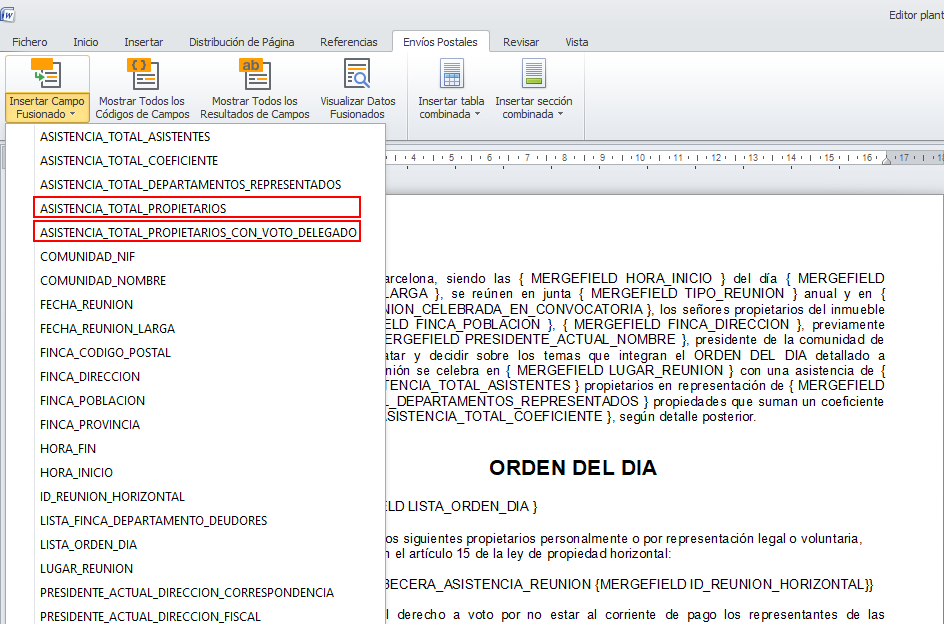 Se han añadido dos nuevos campos fusionados en la plantilla del acta.