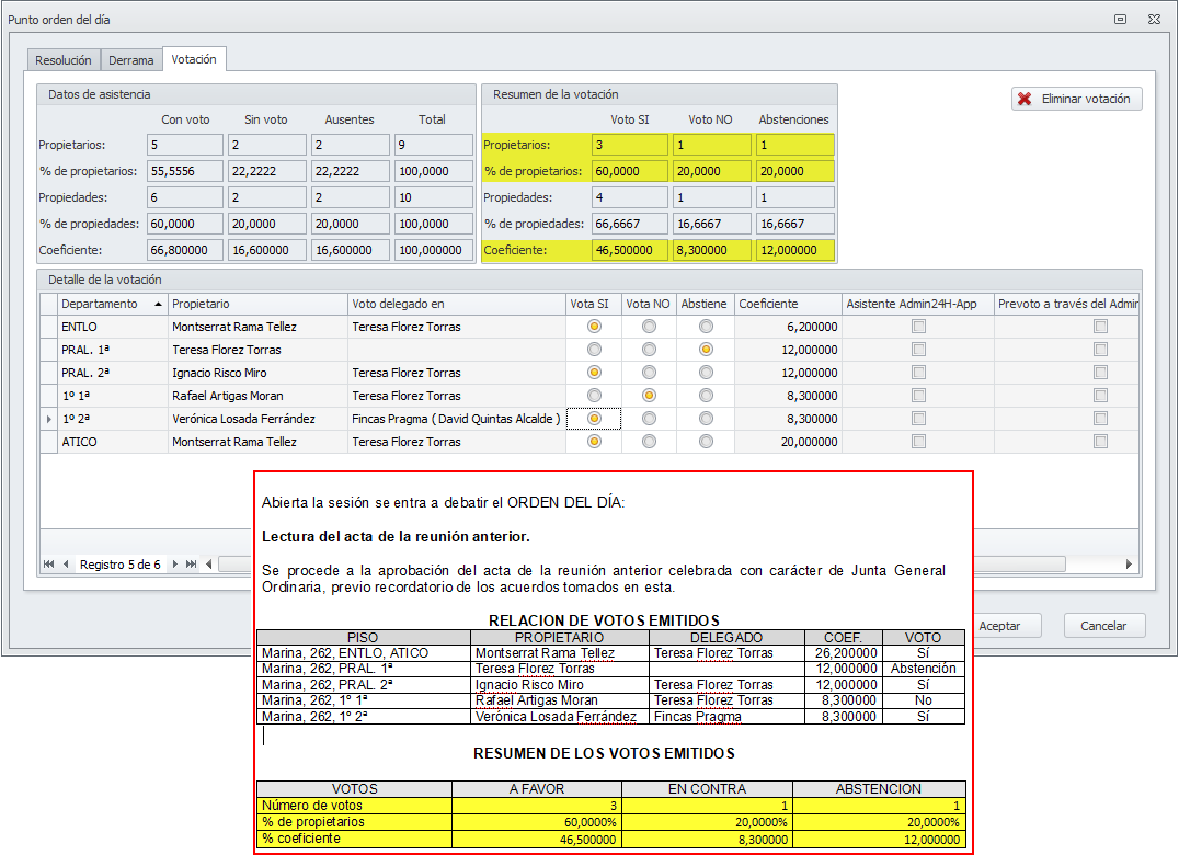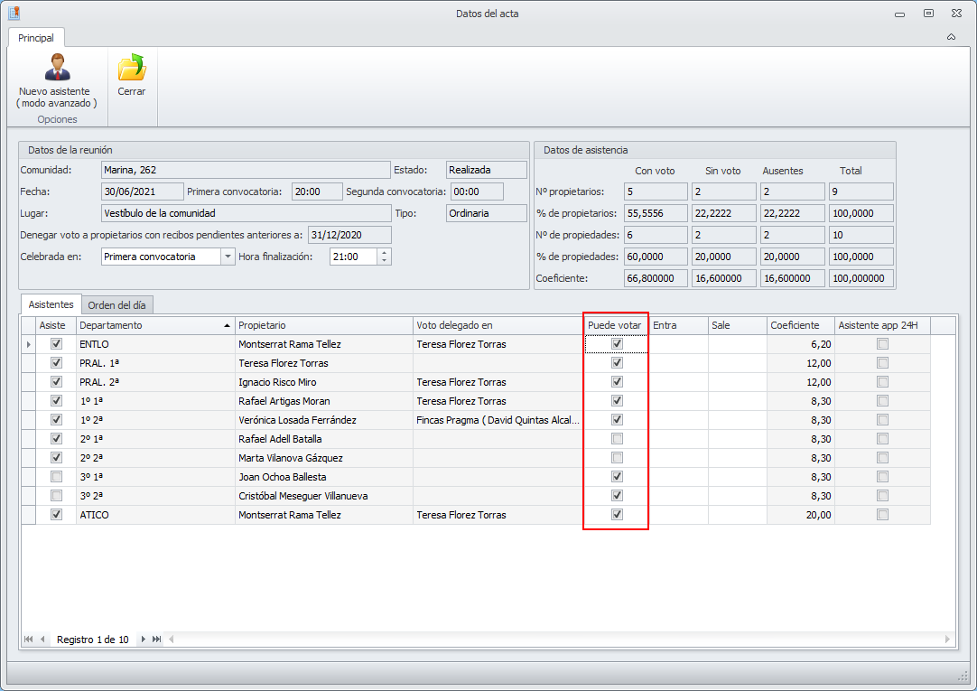 Recuerde que durante el proceso Introducir datos de la reunión puede ajustar el derecho al voto de los departamentos.