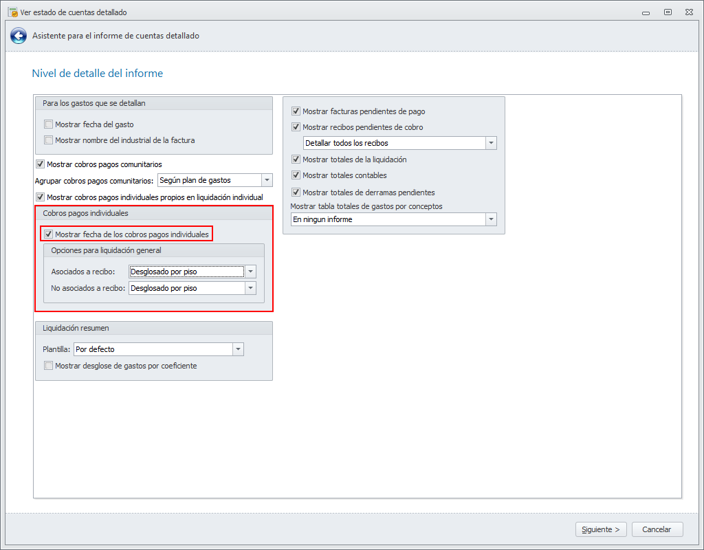 Si, en el apartado Opciones para la liquidación general, la casilla No asociados a recibos indica Desglosado por piso, mostrará la fecha de los cobros pagos si Mostrar fecha de los cobros pagos individuales está activada. Para el resto de combinaciones, no se mostrará la fecha.