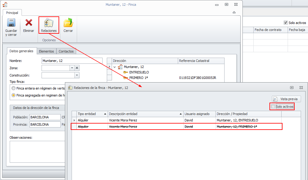 En la vista de relaciones de una finca, se ha añadido la posibilidad de ver sólo las relaciones activas o incluir las que han sido baja, que se muestran tachadas.
