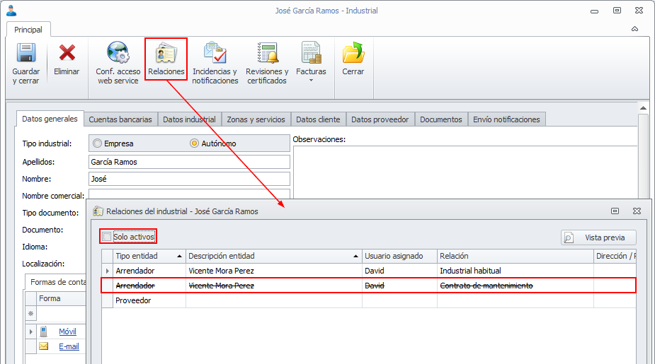 En la vista de relaciones de un industrial, se ha añadido la posibilidad de ver sólo las relaciones activas o incluir las que han sido baja, que se muestran tachadas.