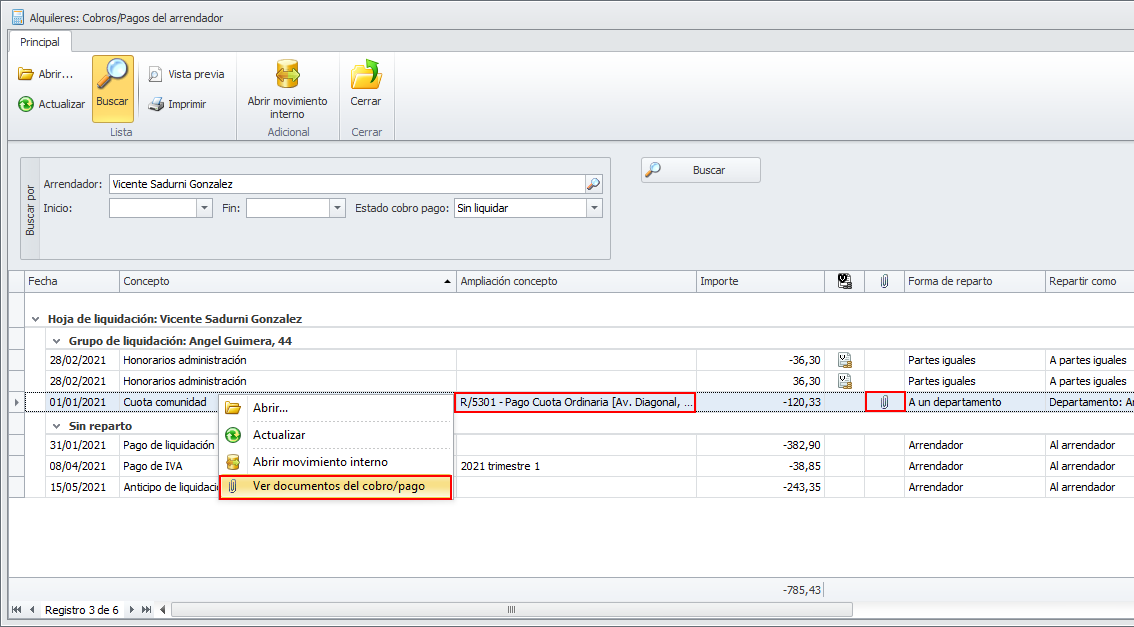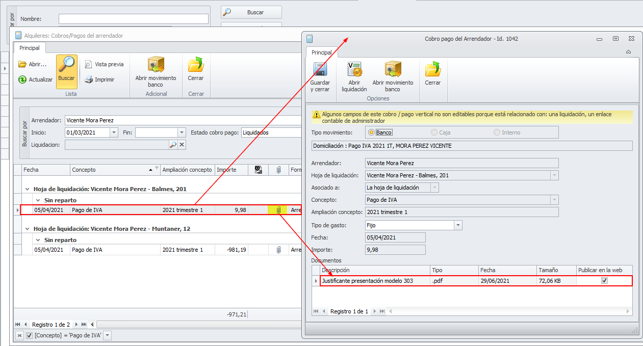 Cuando se adjunta el justificante de presentación de los modelos 303 y 111 del arrendador se guarda automáticamente en los cobros pagos de arrendador correspondientes a ese pago, independientemente de si se efectúa la presentación desde adminet como si se presenta por otros medios y se adjunta el comprobante con posterioridad.