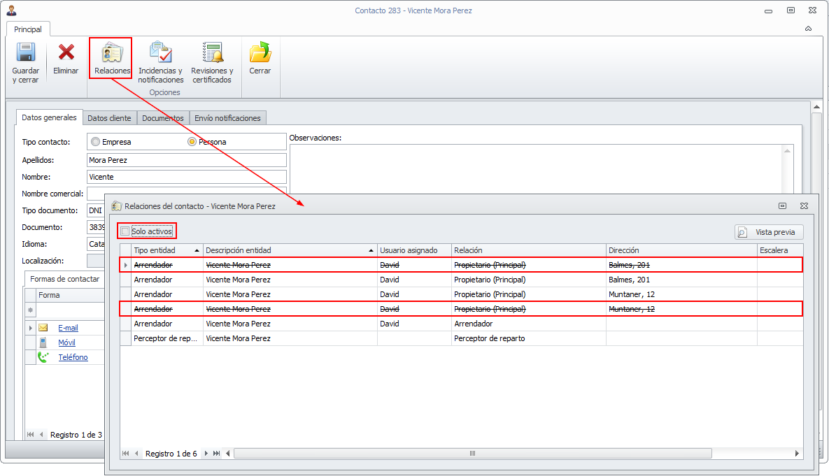 En la vista de relaciones de un contacto, se ha añadido la posibilidad de ver sólo las relaciones activas o incluir las que han sido baja, que se muestran tachadas.