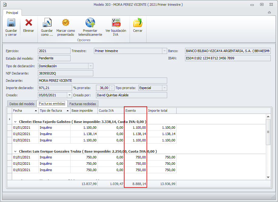 Se ha modificado la ficha del modelo 303 del arrendador para añadir, en las listas de facturas emitidas y recibidas, una nueva columna para informar el importe exento de IVA. De este modo se distinguen claramente las bases imponibles de IVA de los alquileres sin IVA e importes exentos.