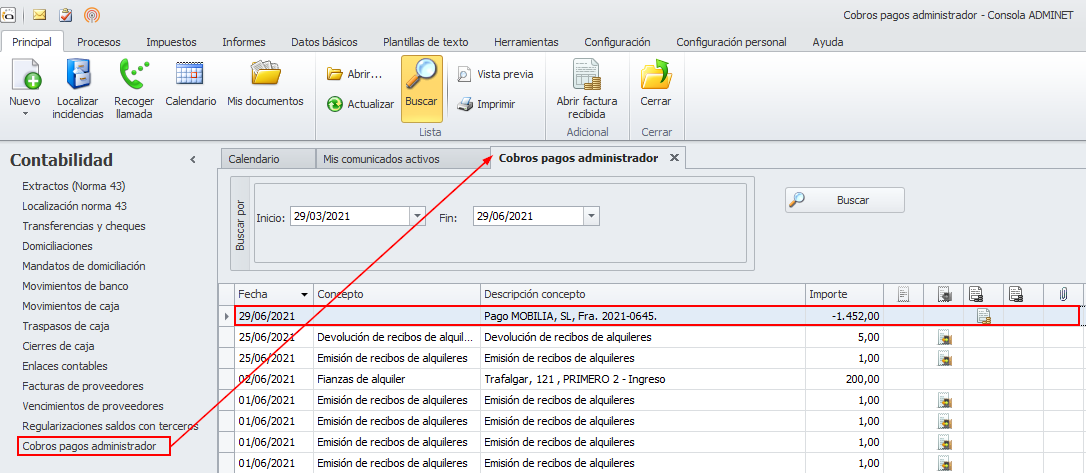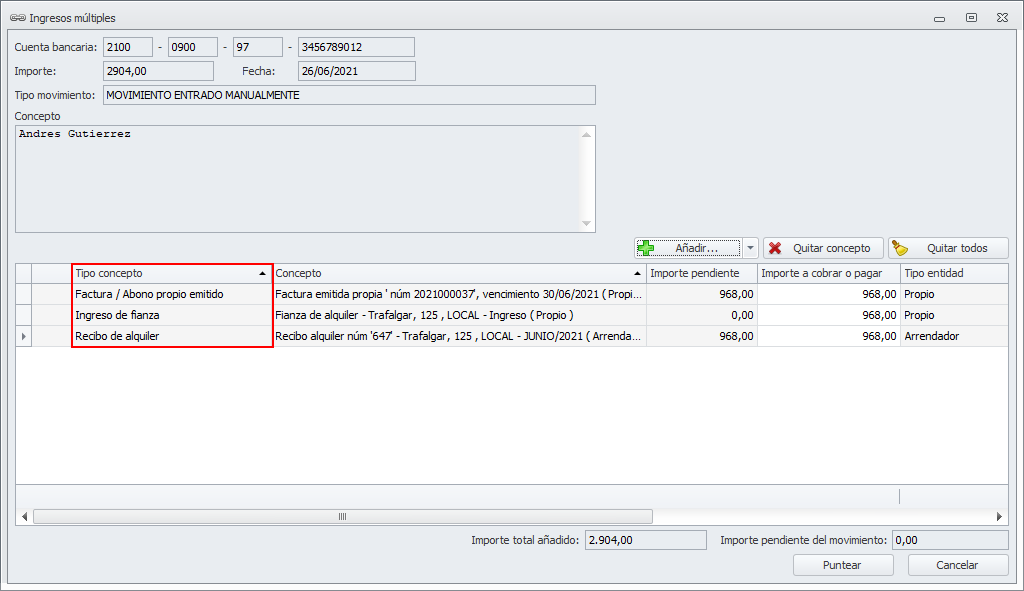 A continuación, puede ver un ejemplo en el que para un único movimiento del extracto se ha procesado el cobro de un recibo de alquiler, un ingreso de fianza y el cobro de una factura de honorarios del administrador.