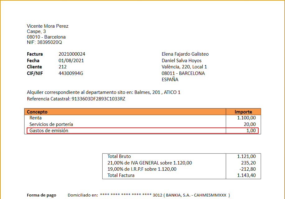 Se permite incluir los gastos de domiciliación bancaria en la factura de alquiler