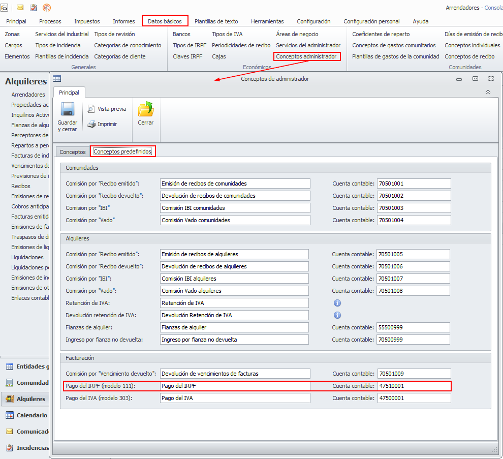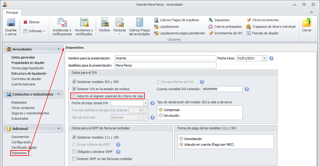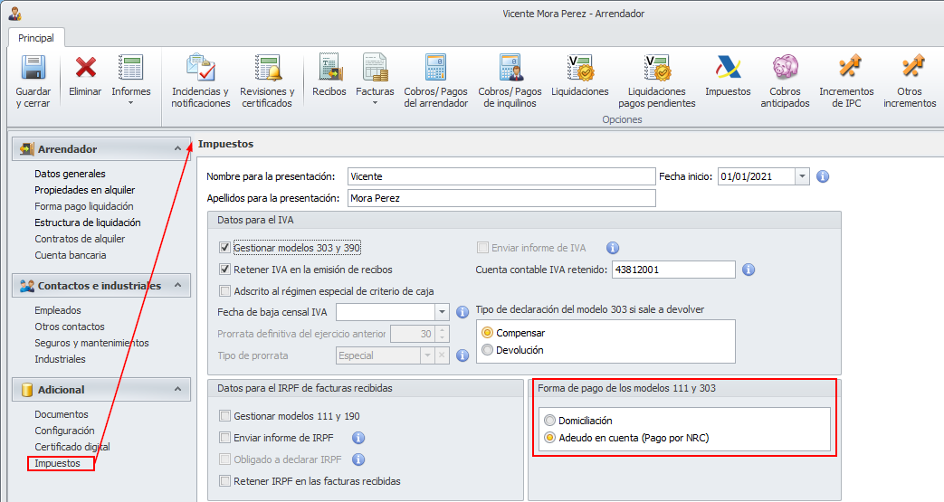 Se ha modificado la sección Impuestos de la ficha del arrendador para impedir que se pueda escoger Domiciliación como Forma de pago de los modelos 111 y 303 ya que un modelo 303 ó 111 con forma de pago Domiciliación requiere una cuenta bancaria a nombre del declarante y no se dispone de ninguna.