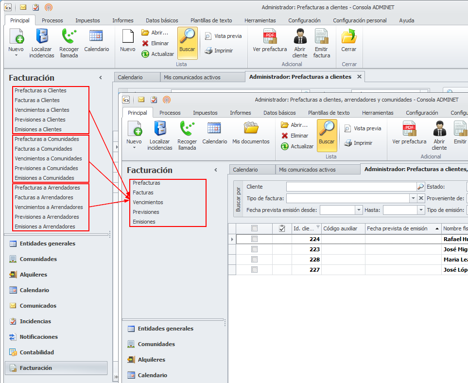 Se han unificado las 5 opciones de cada uno de los grupos Clientes, Comunidades y Arrendadores en un único grupo.