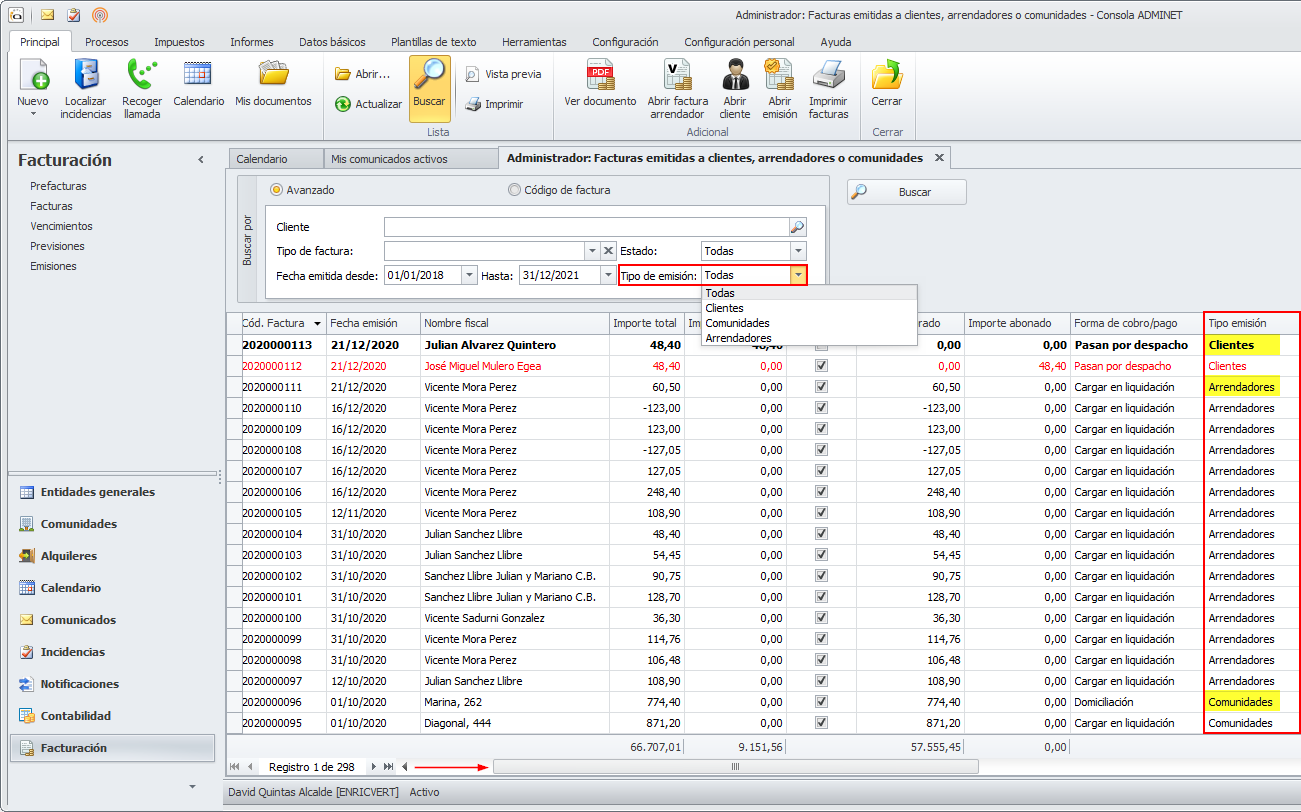 Dentro de cada una de las opciones, se ha añadido una nueva columna con el tipo de emisión y una casilla en el cuadro Buscar por para poder filtrar según el tipo de emisión.