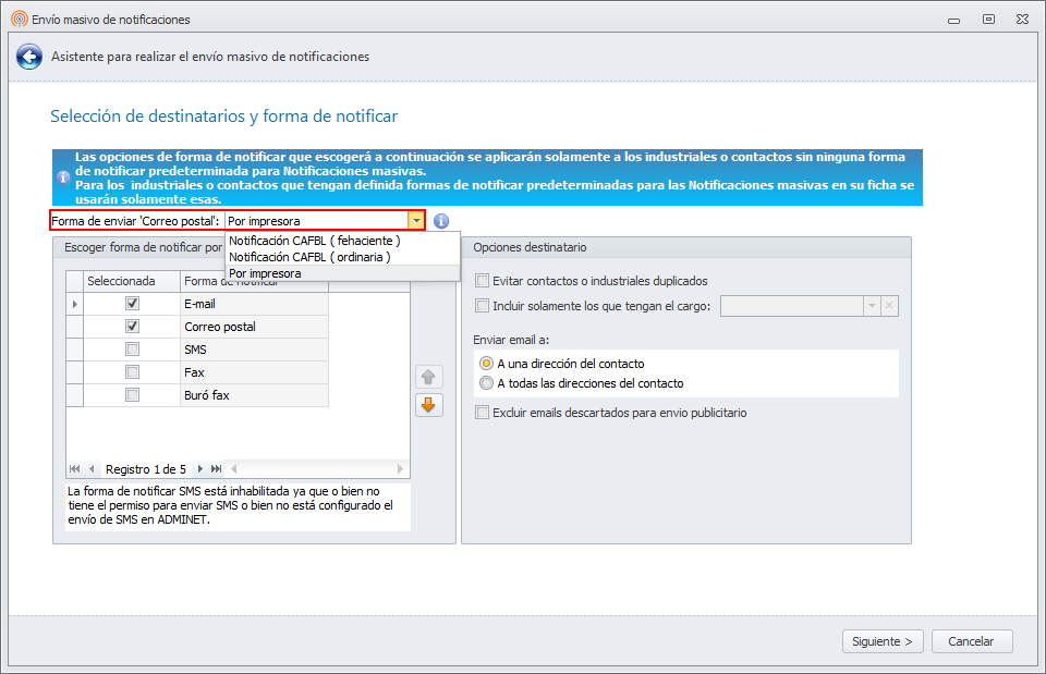 Se han modificado todos los asistentes de notificaciones masivas para añadir una nueva opción relacionada con las notificaciones que se remiten por correo postal.