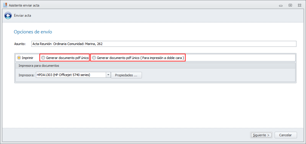 La opción Generar documento pdf único (Para impresión a doble cara) analiza el número de páginas que se remiten a cada destinatario, forzando siempre que sea un número par. De este modo, al imprimir posteriormente el documento pdf a doble cara no se mezclan en una misma hoja páginas de diferentes destinatarios.