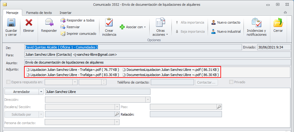 Remitir al inquilino por correo electrónico copia de los recibos cobrados por norma 43