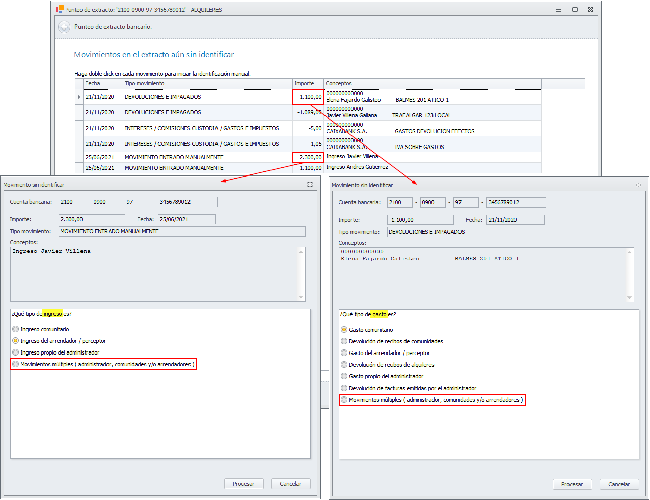 Se ha modificado el selector de opciones de la identificación manual de movimientos para permitir mezclar, para un único movimiento del extracto operaciones de arrendadores y comunidades con otras del administrador.