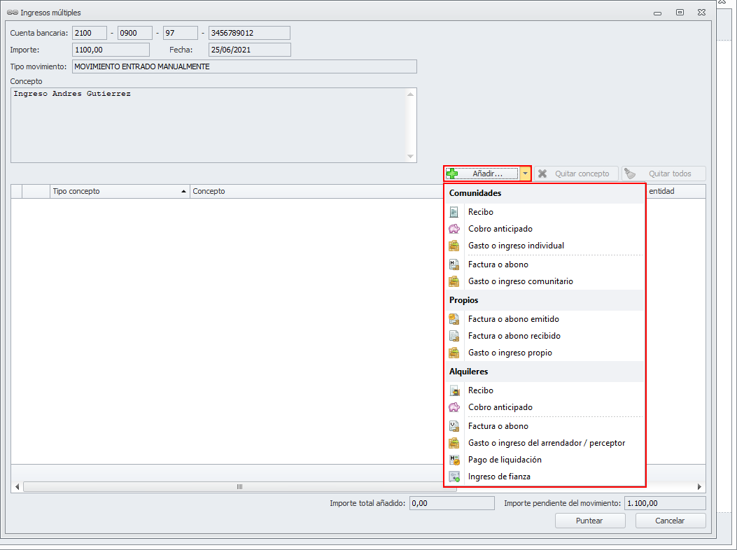 La opción Movimientos múltiples, abre la siguiente ventana, desde la que puede procesar, para un único movimiento del extracto tantas operaciones como necesite, incluyendo cualquier opción de cualquiera de los tres apartados (Comunidades, Alquileres, Propios).
