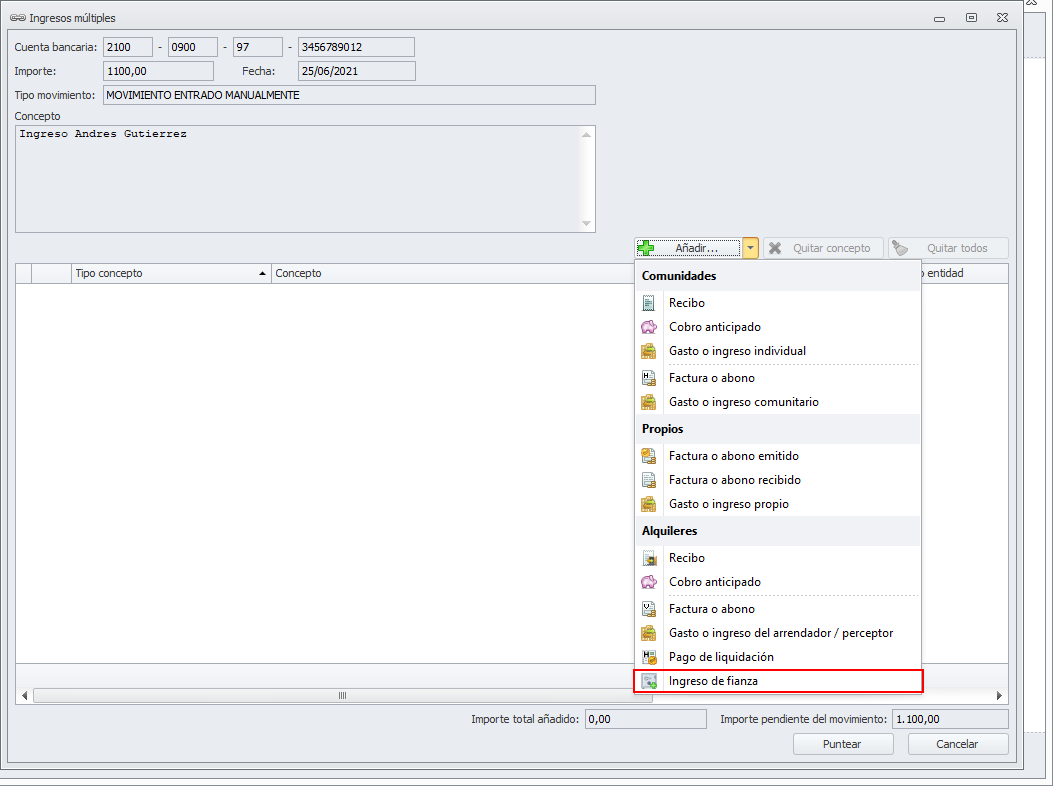 Se incorpora "Ingreso fianza" como opción de identificación manual de ingresos