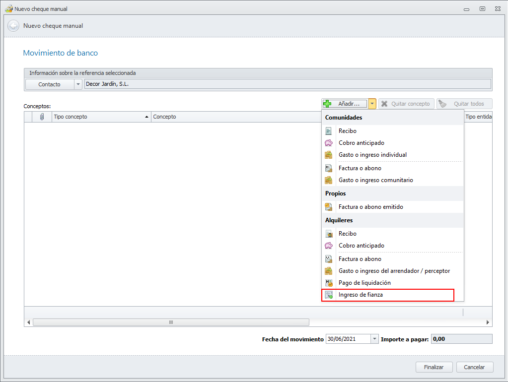 Se incorpora "Ingreso fianza" como opción de identificación en "Cheque manual"