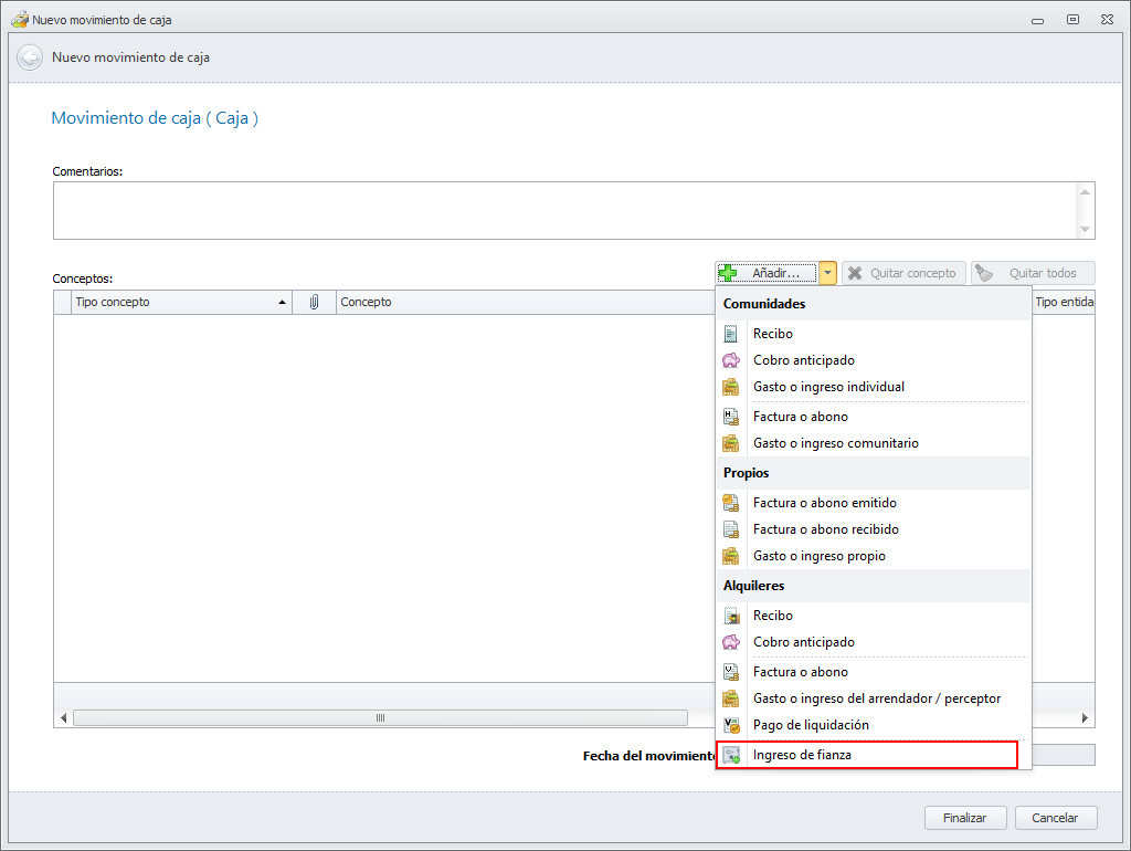Se incorpora "Ingreso fianza" como opción de identificación en "Movimientos de caja"