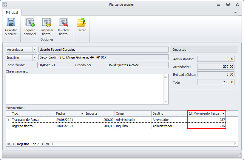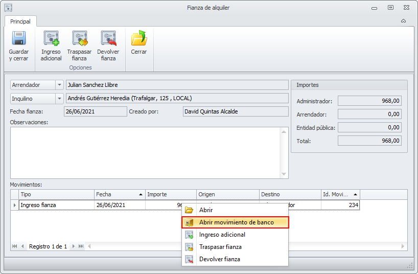 A partir de esta versión, el movimiento de ingreso de fianza se debe realizar desde la identificación manual de movimientos de norma 43 o desde movimientos de caja.