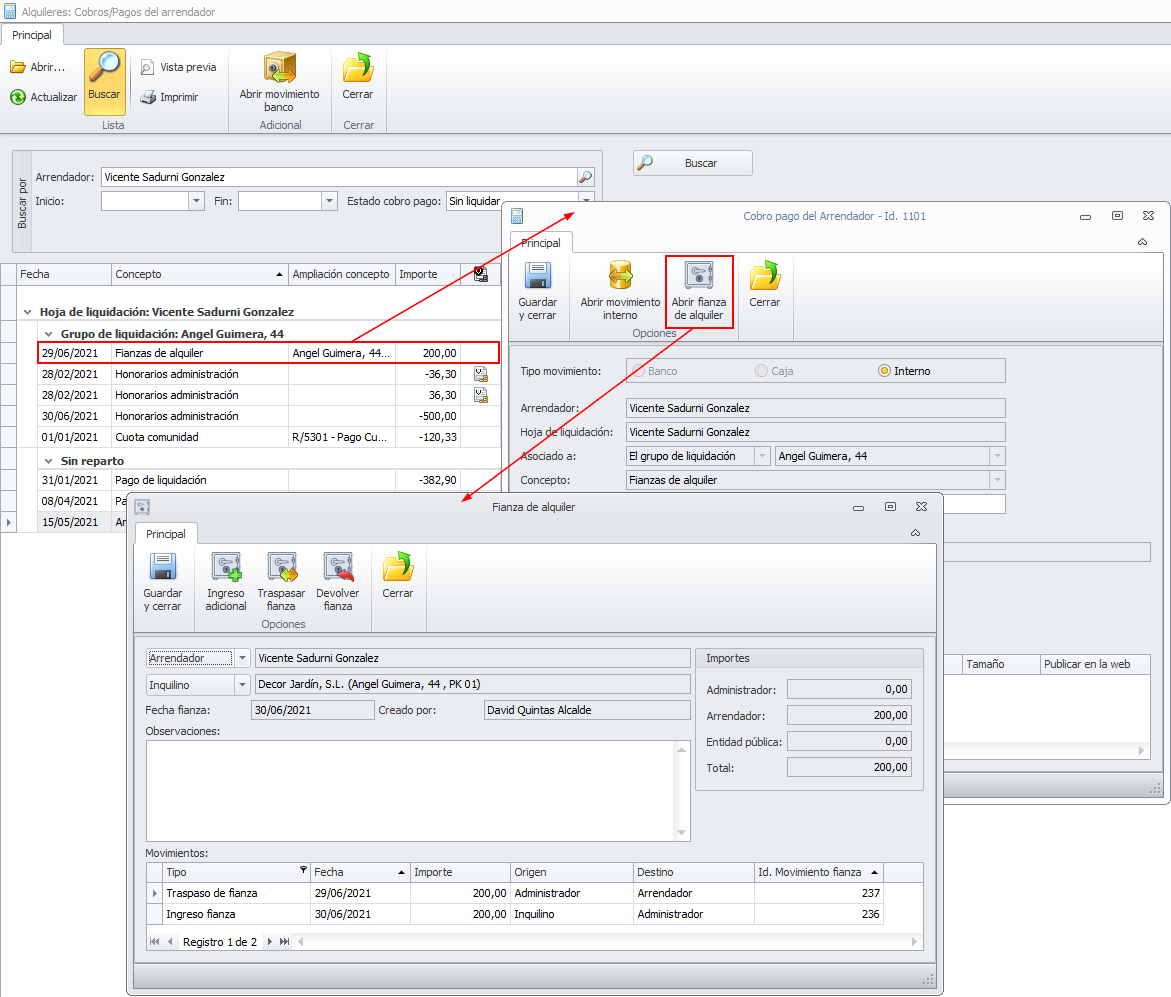 Se ha modificado la ficha de la fianza para que, desde cualquier movimiento de la misma, se pueda abrir el apunte de banco o caja que lo contiene.