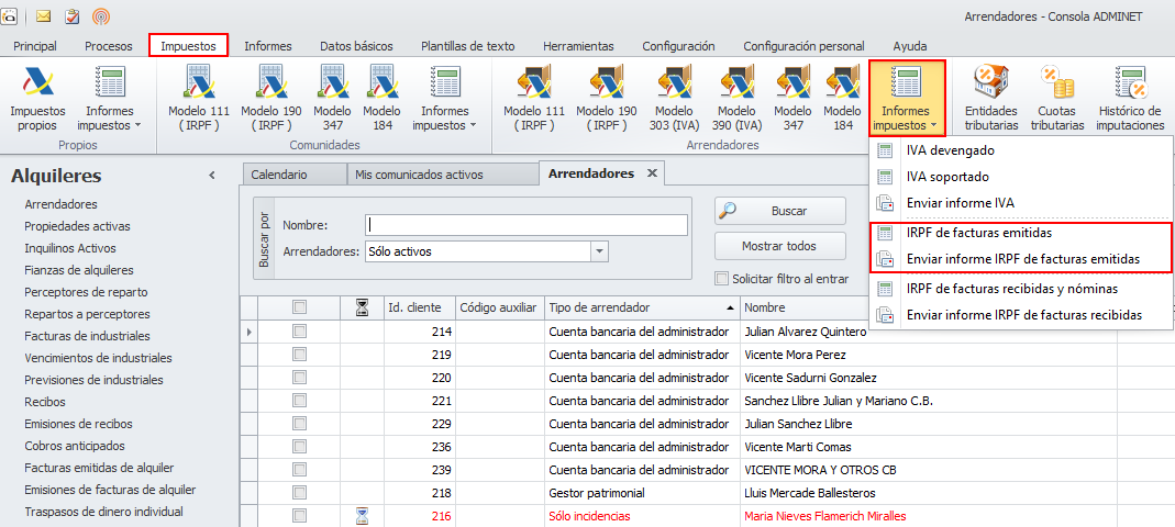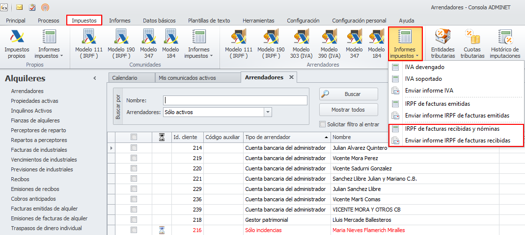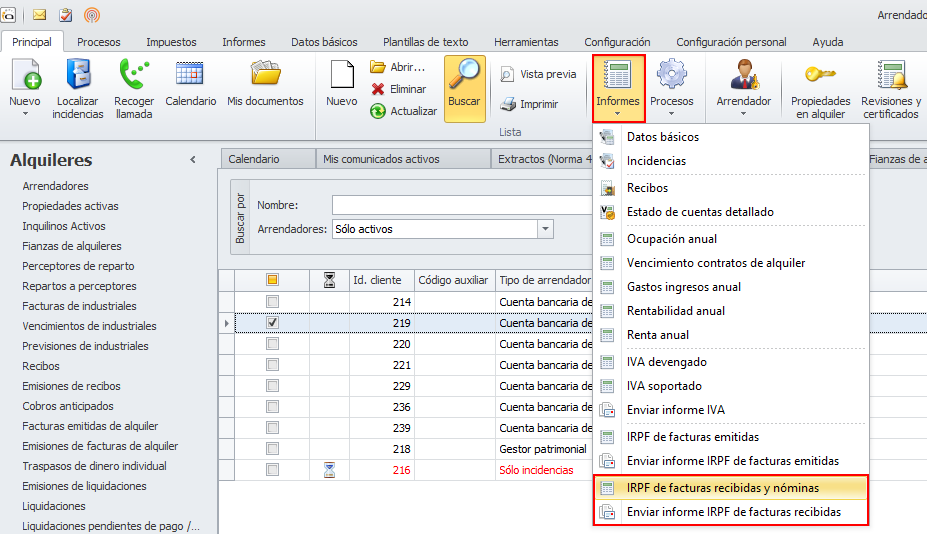 Este nuevo informe reúne las retenciones aplicadas en las facturas de alquiler emitidas por el arrendador, permitiendo facilitarle el informe por correo electrónico o postal.
