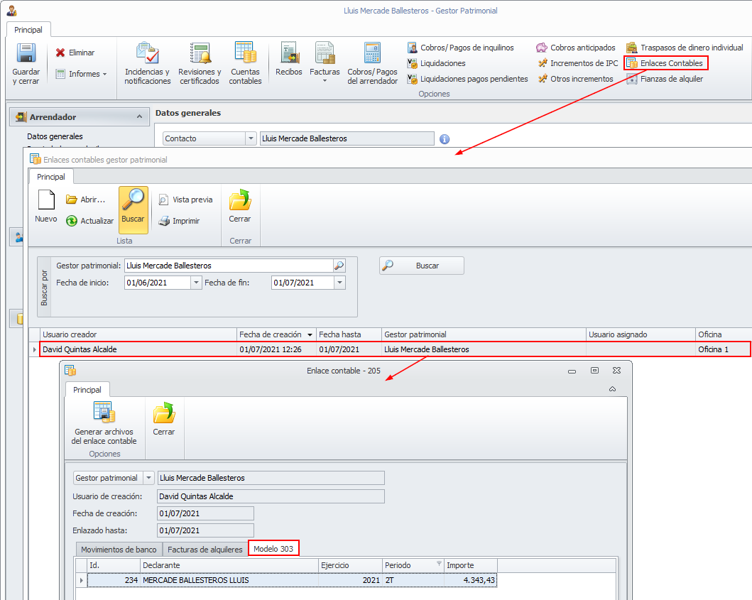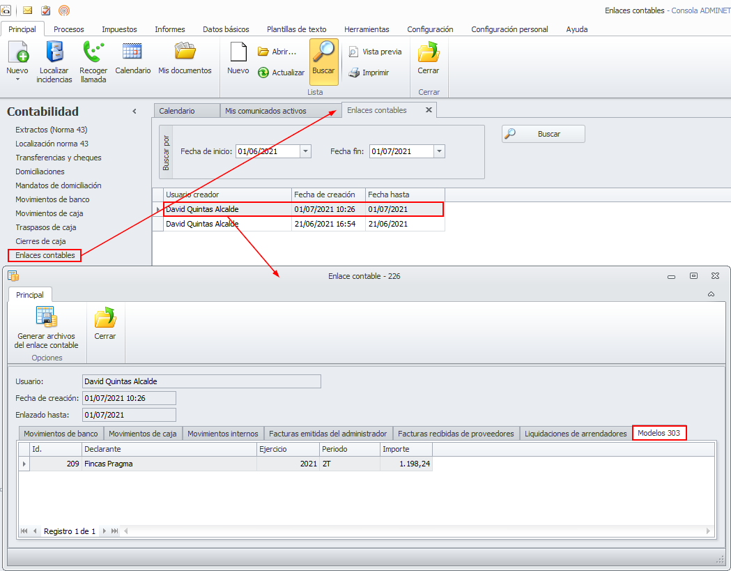 Se han añadido nuevas pestañas en la ficha del enlace contable para mostrar los modelos 111 y 303 que se han enlazado.