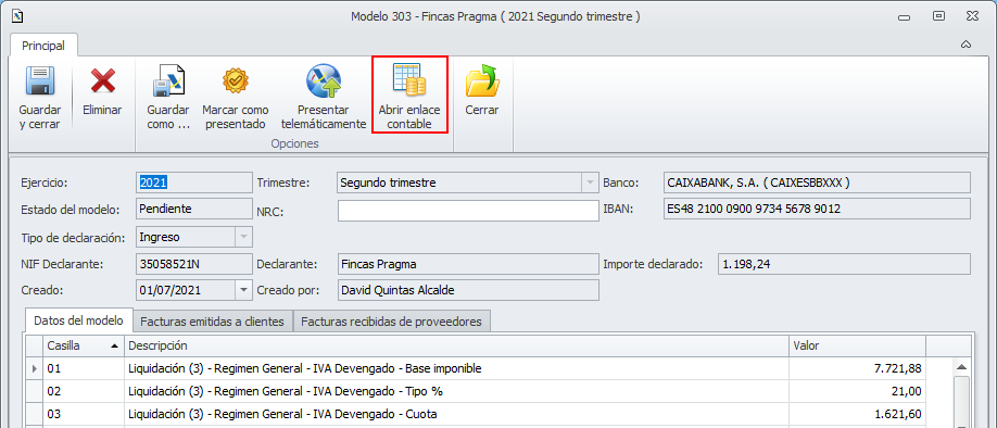 En el caso de que el modelo esté enlazado contablemente, se añade un botón en la ficha del mismo, que permite acceder al enlace contable que lo contiene.
