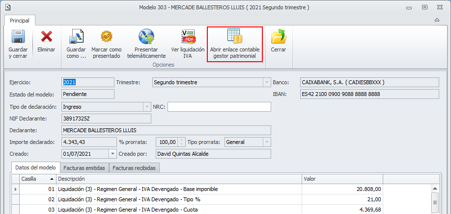 Las facturas emitidas registran el IVA en las cuentas del grupo 477 y las facturas recibidas en las del 472. En cambio el pago del modelo 303 genera un asiento simple que consiste en un haber en la cuenta del banco y un debe en la cuenta asociada al concepto del gestor patrimonial Pago de IVA, que generalmente será del grupo 4750.