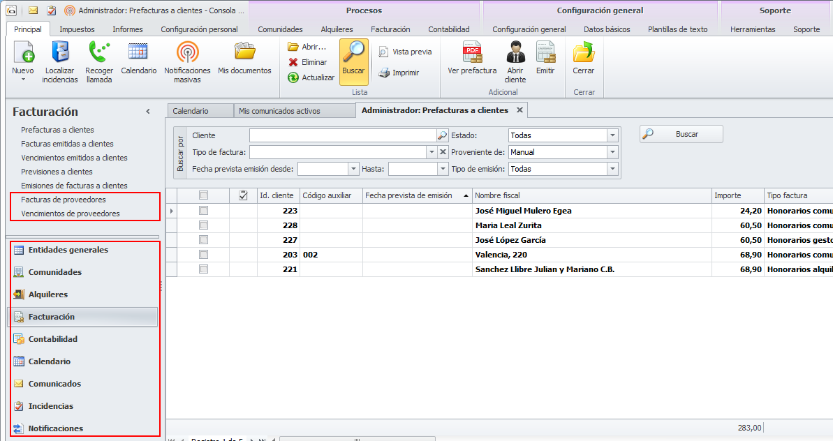 Se ha modificado el circuito de emisión de recibos para que, tras emitir las facturas de alquiler abra el asistente de envío de dichas facturas.