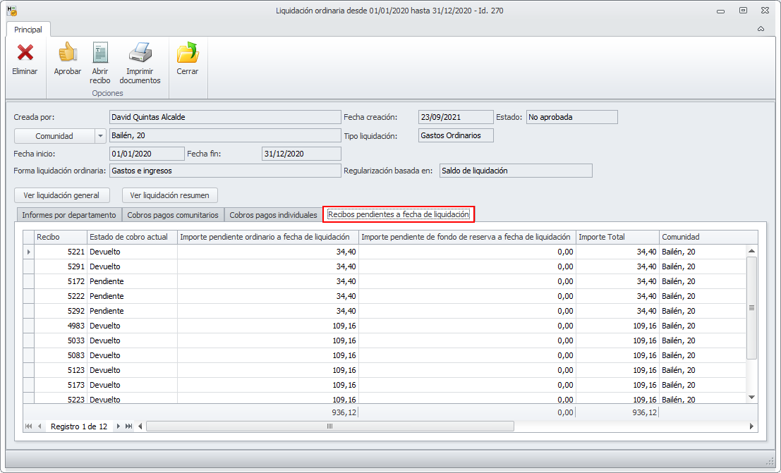En la liquidación ordinaria se controlan los recibos pendientes a fecha de cierre de liquidación