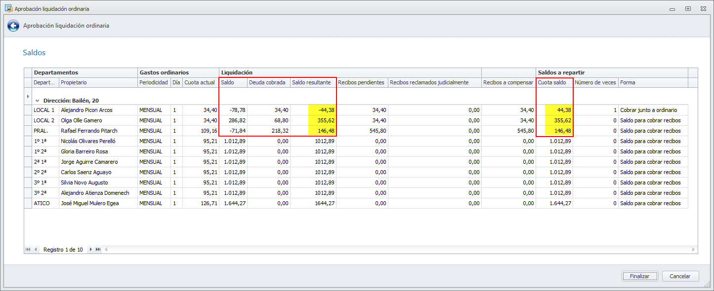 Se ha añadido, a la aprobación de la liquidación, la posibilidad de que el recibo de saldo a los propietarios se genere por la diferencia entre los gastos repercutidos a cada departamento y los importes de los recibos emitidos durante el ejercicio.