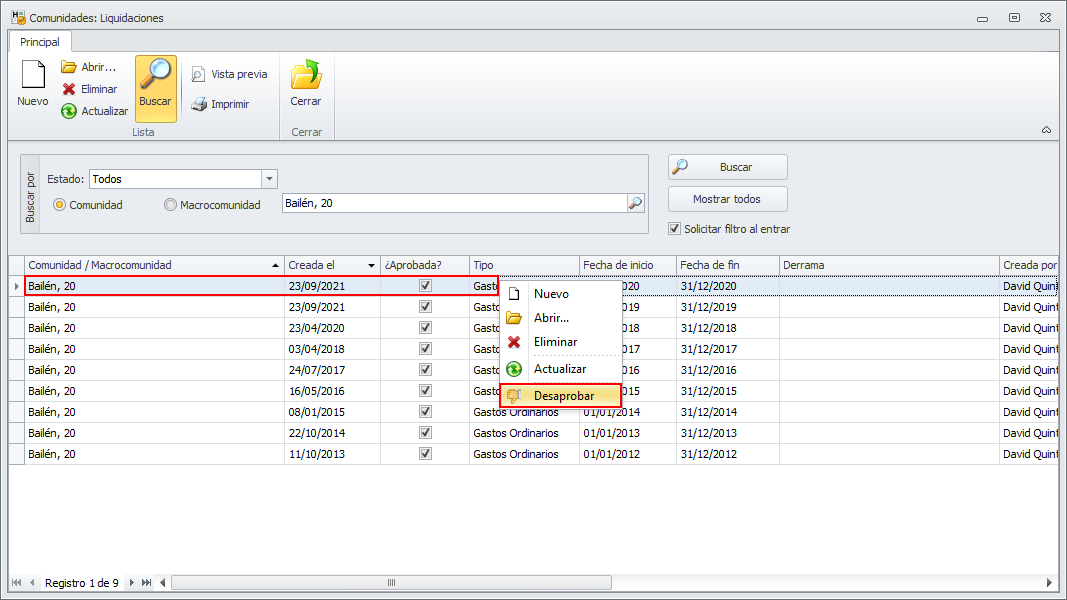 La lista de liquidaciones y la ficha de la liquidación, en caso de estar aprobada, incluye un botón que permite desaprobarla.