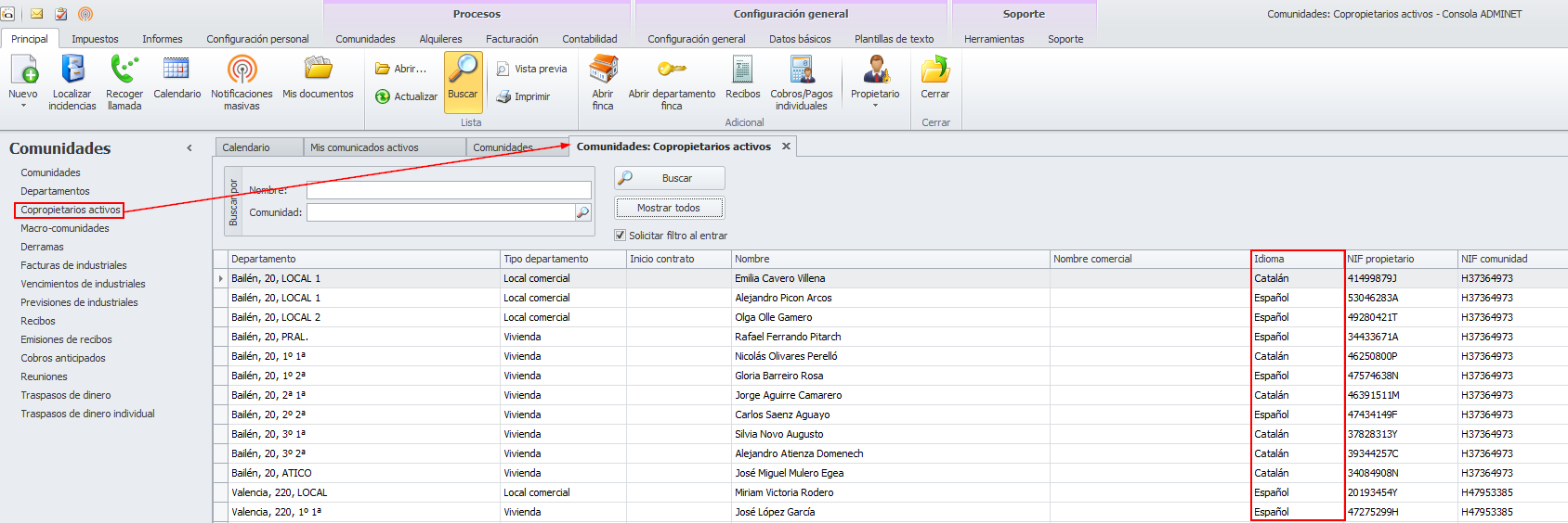 Se añade columna idioma en la vista de copropietarios activos