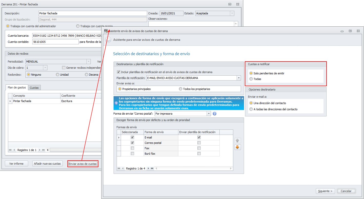 Se ha modificado el asistente de envío de avisos de cuotas de derramas, incorporando un selector que permite indicar si se notifican sólo las cuotas pendientes de emitir o si se notifican todas.