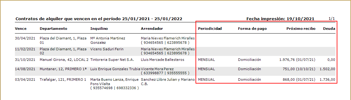 Se añaden columnas informando del importe y fecha de emisión del próximo recibo, la periodicidad del mismo, la forma de cobro y el importe pendiente de cobro del departamento en el momento de emitir el informe.