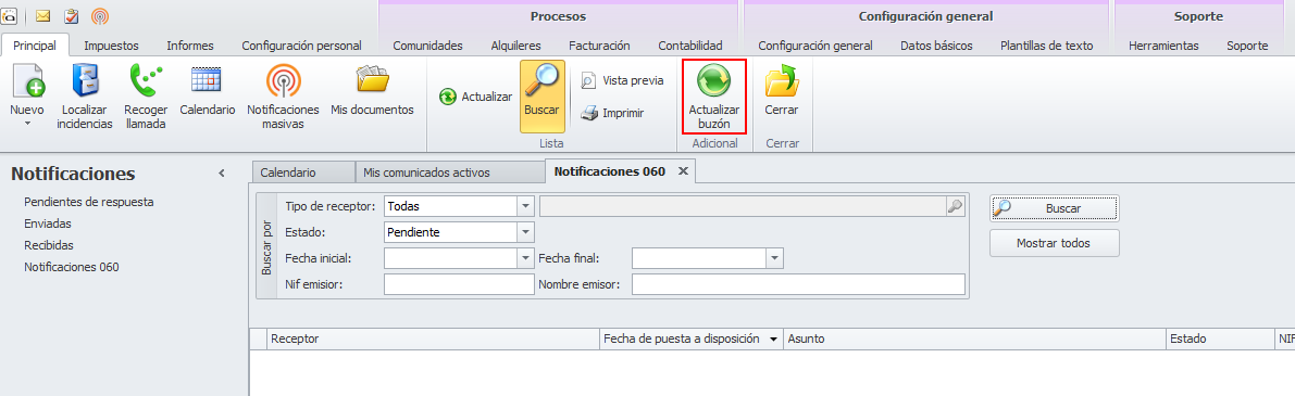 En la opción Notificaciones 060 del apartado Notificaciones, al hacer clic en el botón Actualizar buzón se fuerza la conexión y descarga de las nuevas notificaciones.