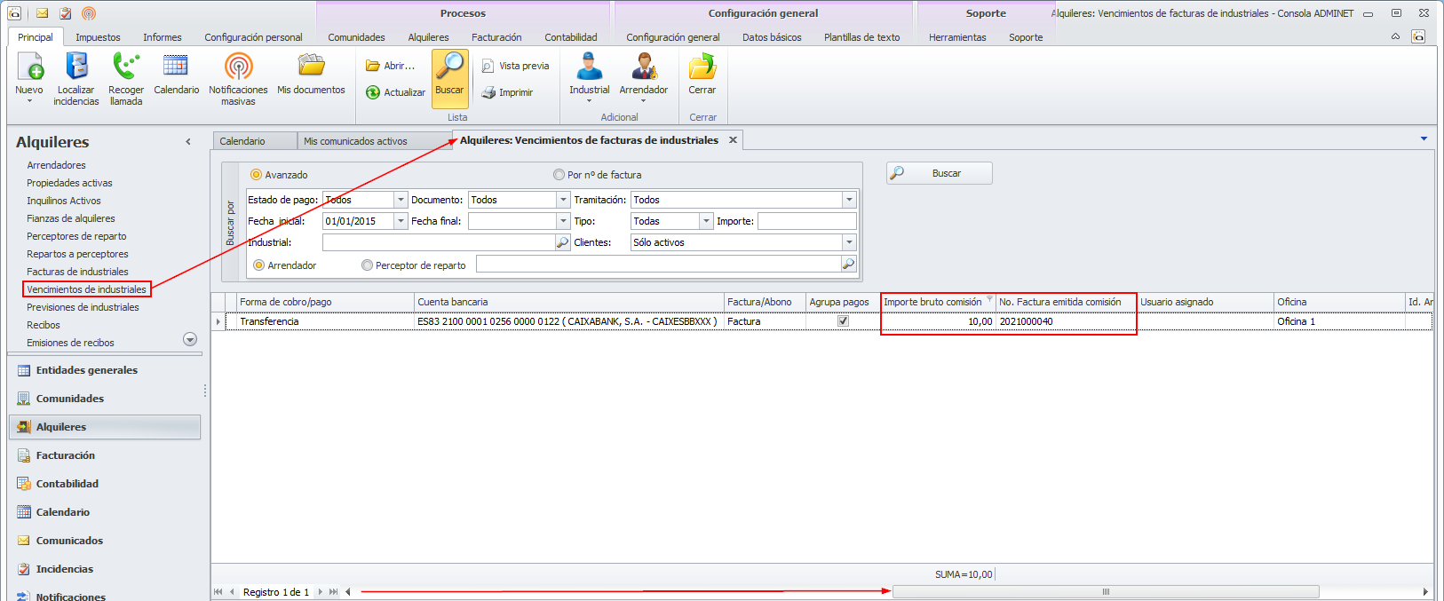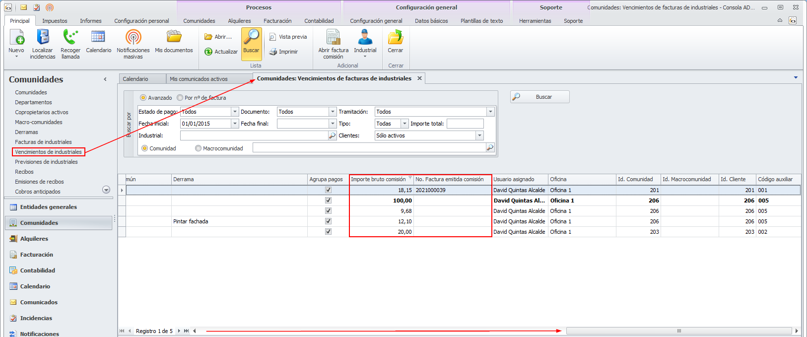 Se ha modificado la vista de vencimientos de facturas de industriales para añadir dos nuevas columnas que informan del importe bruto de comisión descontad en ese vencimiento y el número de factura en que se ha facturado al industrial. Para ver estas columnas debe desplazar la vista hacia la derecha.