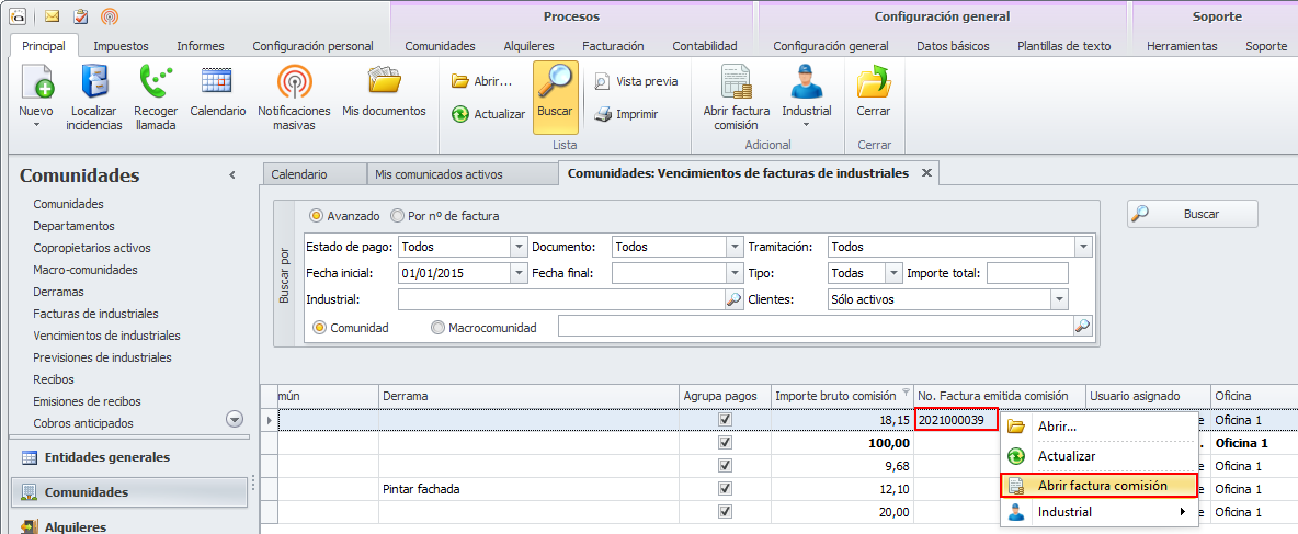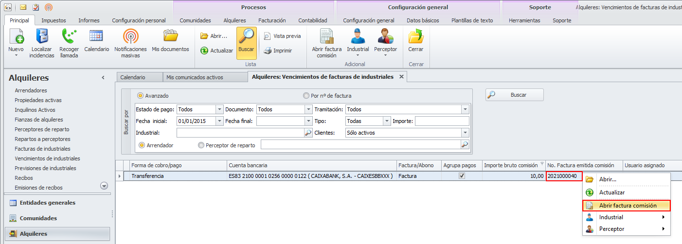 Si se hace clic derecho sobre una línea de vencimiento con factura de comisión emitida, se permite abrir la factura generada por el administrador.