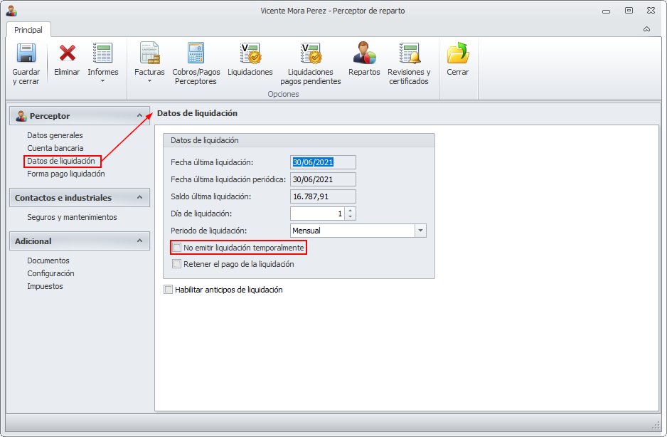 Nueva opción “No emitir liquidación temporalmente” en hojas y grupos de liquidación y en perceptores de reparto