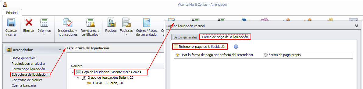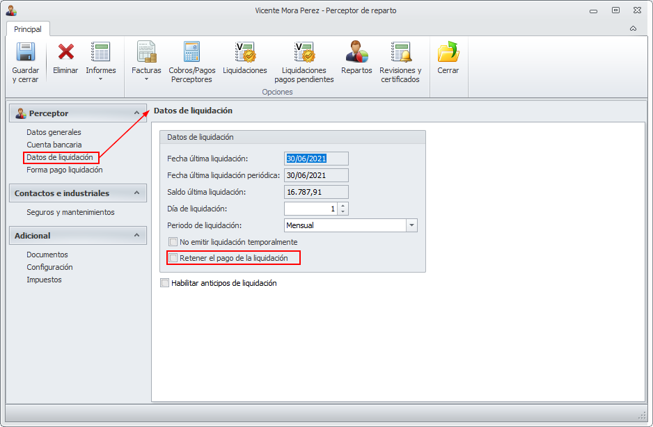 Nueva opción “Retener el pago de la liquidación” en hojas de liquidación y en perceptores de reparto