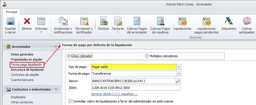 En el caso de la hoja de liquidación, el valor de esta casilla únicamente tendrá utilidad si la forma de pago de la liquidación es Pagar saldo, tanto si se determina en la propia hoja de liquidación, como si se determina en la forma de pago por defecto del arrendador, como puede verse en la siguiente imagen.